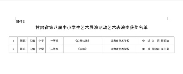 近日,甘肃省教育厅公布的全省第八届中小员工艺术展演评选活动结果中,永利3044noc参加展演的原创舞蹈《白马姑娘》荣获中学舞蹈乙组一等奖,参加展演的是舞蹈表演专业(中专)刘蕊丹等24名员工,指导教师:李斌、张莉、颜昭洁;器乐合奏《苦韵》荣获中学器乐乙组二等奖,展演员工:戏曲音乐专业(中专)王璞玺、张生勇,指导教师:董婷、雷建超、吴尔曼;舞蹈《白马姑娘》荣获优秀创作奖;甘肃省艺术学校荣获优秀组织奖。
